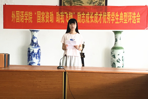 在评选会中,8位家庭经济困难学生代表与在场同学们分享了自己在大学阶段的学习和成长经历。他们虽然家庭经济上存在一定困难,但是在生活态度上却乐观向上。他们中的很多人不仅学习成绩优异,而且在参与社会实践、志愿服务和担任学生干部的工作中都取得了骄人的成果。其中,英语1302班的石贤同学来自贵州侗寨,她热爱民族文化,曾带领暑期实践团队对侗族大歌的传承和发展进行了系统深入的调研;英语1302班的杨柳同学放眼社会,曾带领团队参与“挑战杯”学术科技作品竞赛并获得了校赛一等奖的好成绩;法语1301班的王文文同学在担任班长的过程中,兢兢业业地为班级同学做好服务,同时她撰写的《用火色渲染平淡人生》入围2015年度助学成才典型事迹征文省级评选;法语1401班的刘雅惠同学在接受国家资助的同时不忘回报社会,积极利用课余时间参与志愿服务活动。