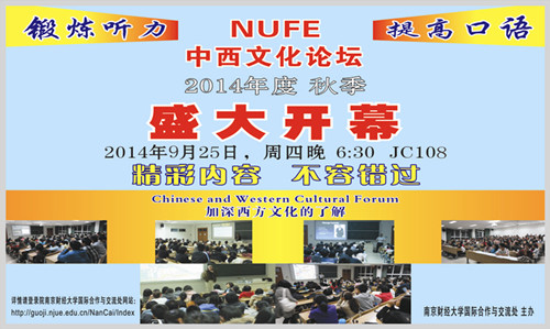 2014年秋季学期“中西方文化论坛”第一期即将开讲。时间定于2014年9月25日(周四)晚6:30-8:30,地点为JC108。论坛中会穿插英语角活动,敬请广大师生关注。
