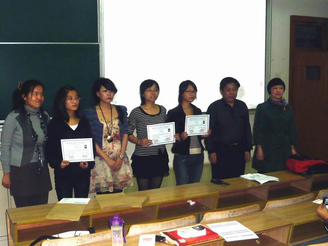 首先肖辉教授、李俊儒教授以及TOEIC中国区市场主管万美玲女士为在今年8月29日参加“托业贫困生助学金”项目中取得优异成绩的费莹琳,陈丽芳,蔡晓莉,赵星波等四位同学颁发了获奖证书。