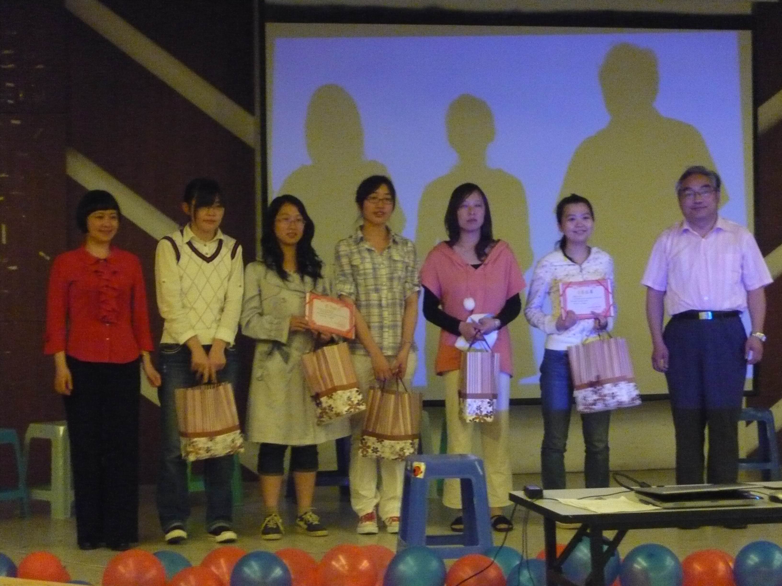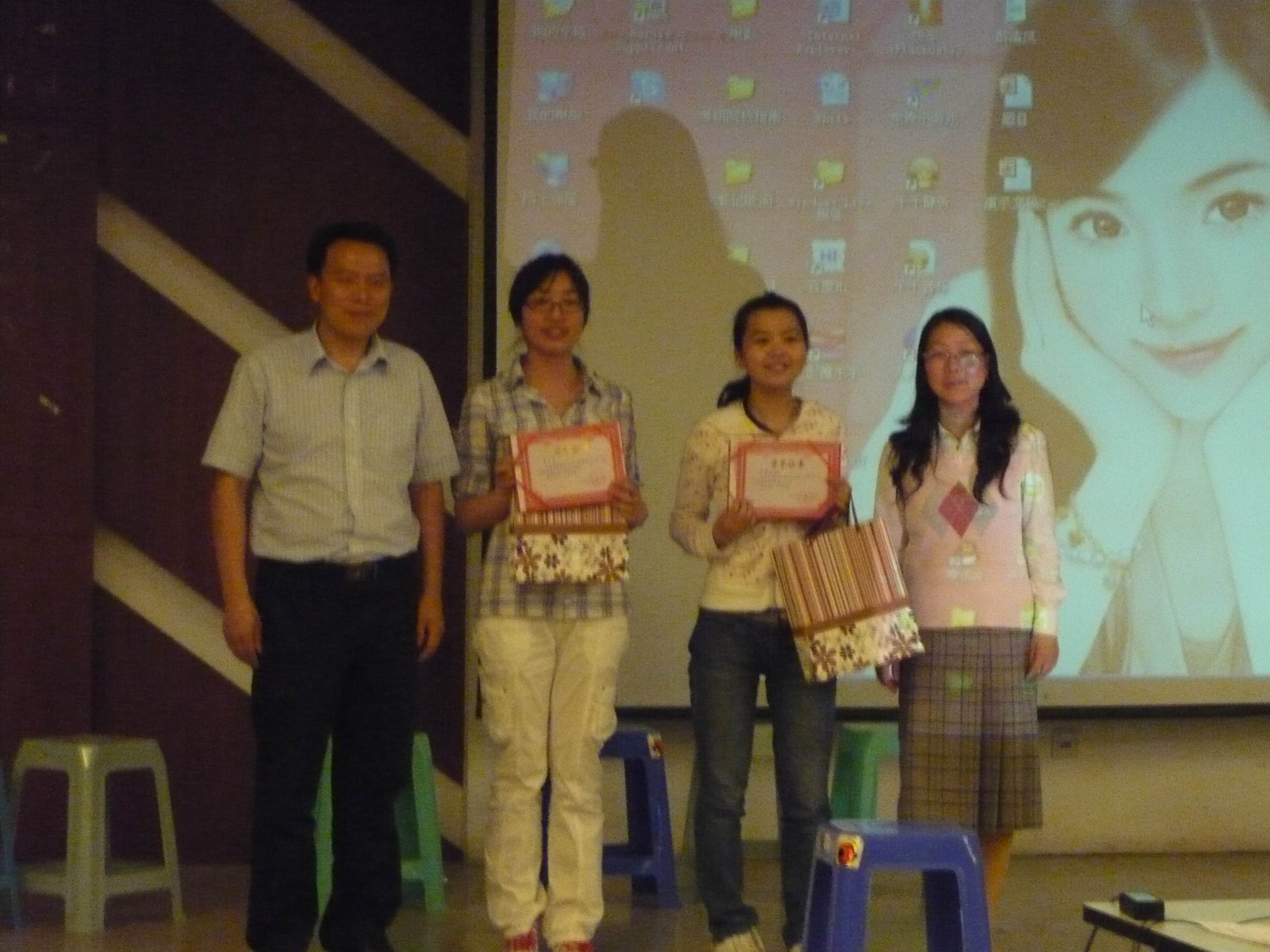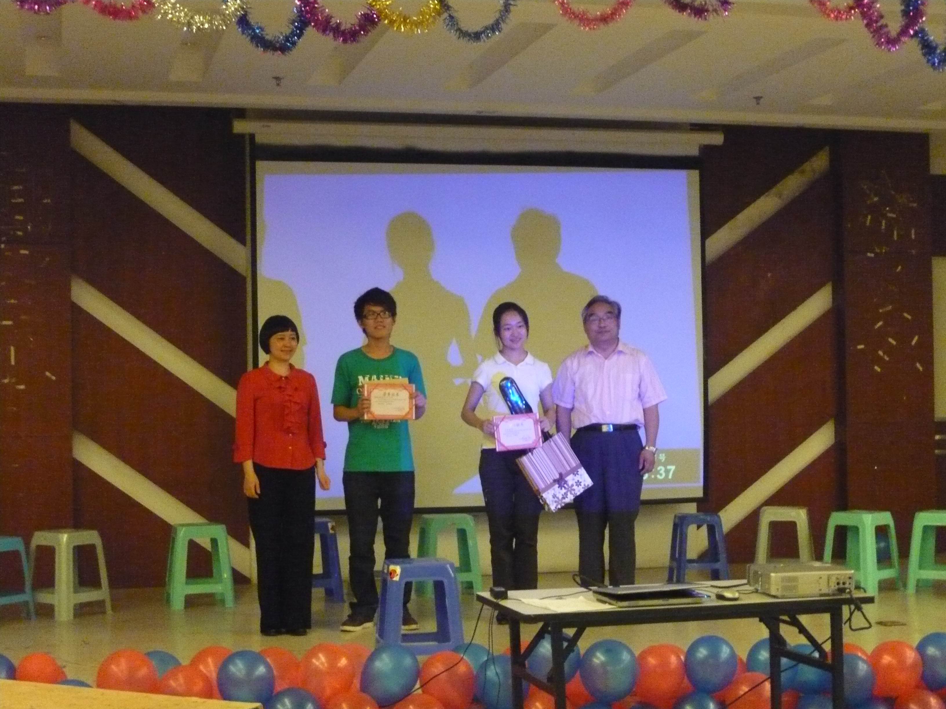 比赛接近尾声时,激动人心的颁典礼奖在欢快的音乐下进行,王克明院长、肖辉书记、孙勇彬副院长、金立林老师等人依次给在第七届英语文化节一系列活动中获奖的集体或个人颁发荣誉证书和丰厚的奖品。南京财经大学第七届英语文化节从“TOP SALES”、名人模仿秀、班级对抗赛到今天的趣味英语大比拼,涉及有社会交际的实践、学生德智体素质的拓展和班级凝聚力的强化工作,很好地做到了寓学于乐、寓教于乐,激发学生在浓厚兴趣的鞭策下主动地强化英语学习,提升自我境界,为成为社会所需的“十”字型人才而不懈努力、奋力前行。