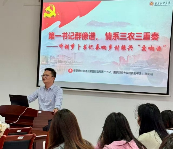 课程伊始,胡新蕲老师以全省获奖优秀党课为蓝本,结合自身两年多徐州丰县驻村一线实践经历,围绕助力产业、人才、文化、生态、组织五大振兴,深情分享“胡萝卜书记”扎根乡村的实干故事。他深入解读二十届四中全会与“十五五”规划乡村全面振兴重要部署,阐释江苏在全国三农工作中“挑大梁、担重任”的使命担当,直观对比苏南、苏北农村发展差异,让同学们深刻领会乡村振兴战略的深远意义与现实内涵。