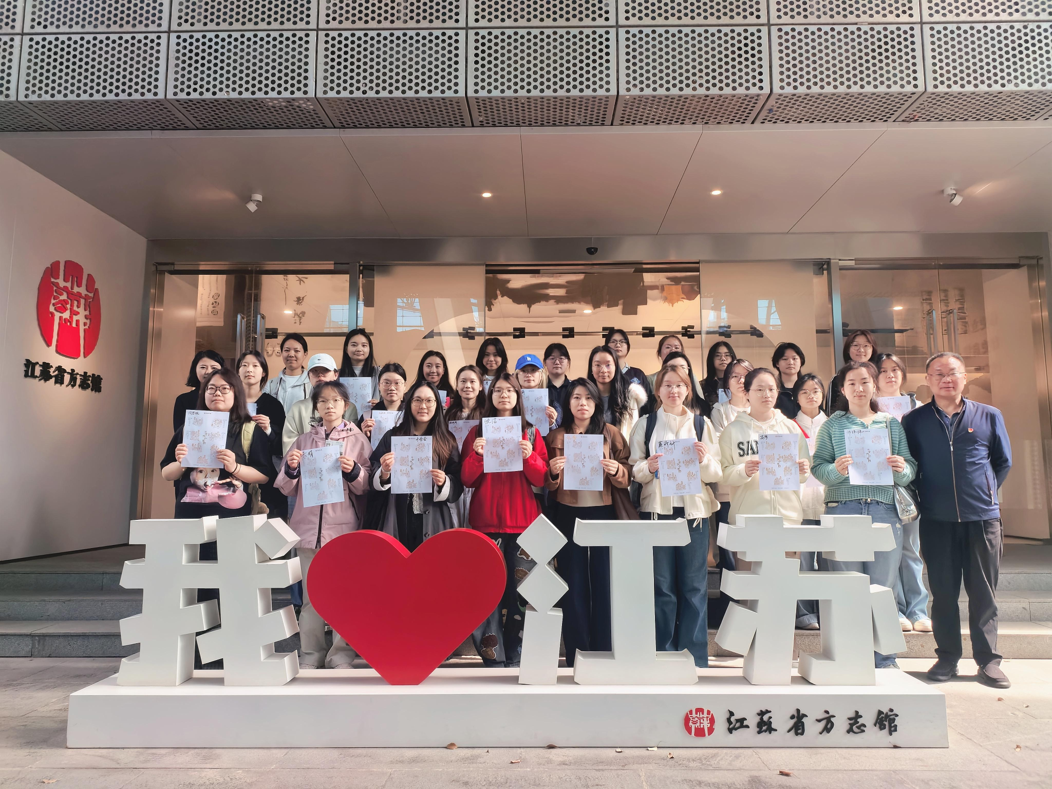 活动结束后,学员们在馆前“我爱江苏”主题雕塑前合影留念。大家纷纷表示,此次专题实践活动不仅让自己深入了解了江苏的历史文化与发展成就,更让大家在方志文化中接受了一次深刻的党史教育与思想洗礼。作为新时代青年大学生,要从江苏的发展历程中汲取奋进力量,传承红色基因,厚植家国情怀,将个人成长融入国家发展大局,努力学习专业知识,提升综合素养,为传承中华优秀传统文化、建设社会主义现代化强国贡献青春力量。