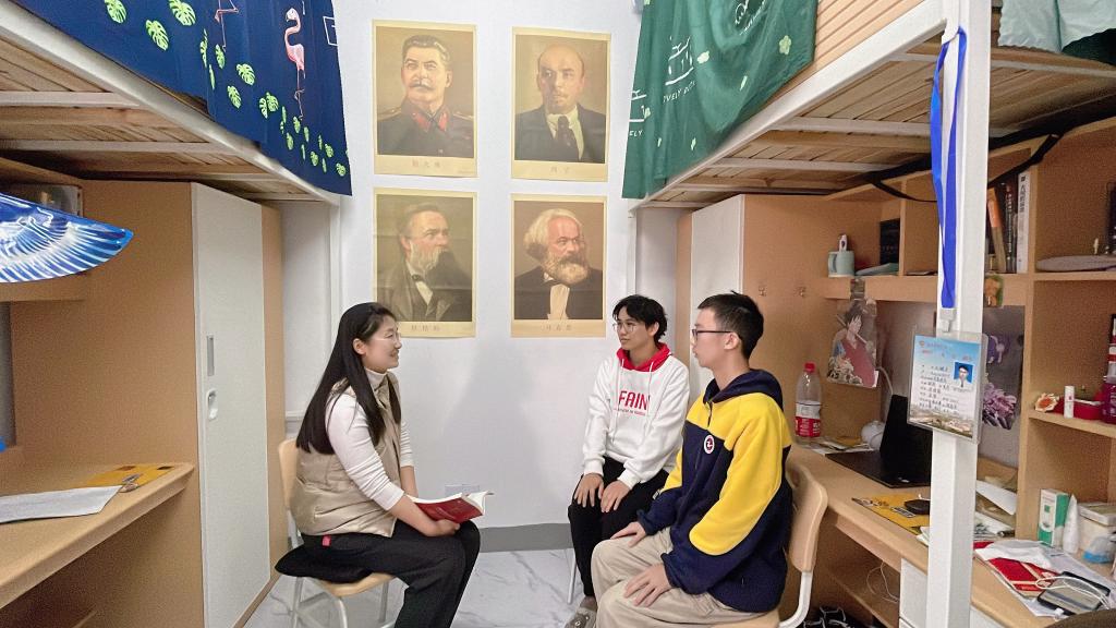 打开学生寝室的大门,目之所及皆是红色元素。寝室里鲜艳的五星红旗,马克思、恩格斯以及伟大领袖的挂画,庆祝中国共产党成立100周年的海报和红船精神的墙贴,充分展现出宿舍成员对共产主义的坚定信仰。学生寝室里,刘英华副书记以“百年奋斗史中感悟马克思主义的真理伟力”为主线,用富有时代气息的语言和贴近青年人的表达形式,深入浅出地在回归本源、回溯历史、回应现实中分析了马克思主义在中国广泛传播的过程,以及中国共产党建立的历史意义,旁征博引地从中国共产党百年奋斗成功的重要密码中引导学生们运用马克思主义分析和回答中国共产党为什么“能”,中国特色社会主义为什么“好”,给寝室成员补充精神“营养剂”。
