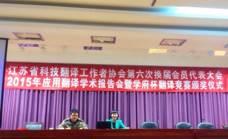 江苏省科技翻译工作者协会于2015年1月19日下午14:00在江苏省科技情报研究所二楼多功能厅召开了江苏省科技翻译工作者协会第六次换届会员代表大会2015年应用翻译学术报告会暨学府杯翻译竞赛颁奖仪式。
