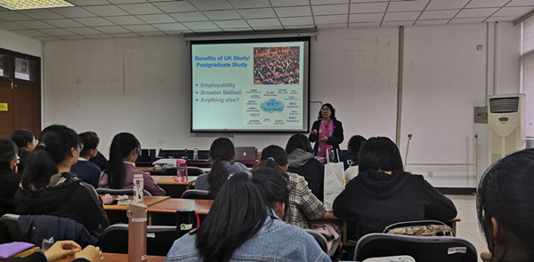 然后,曾俊英博士关于思克莱德大学的地理位置、基础设施、留学生生活等方面向同学们做了详细的介绍,还为同学们分析了可以申请的专业和相应的要求。
