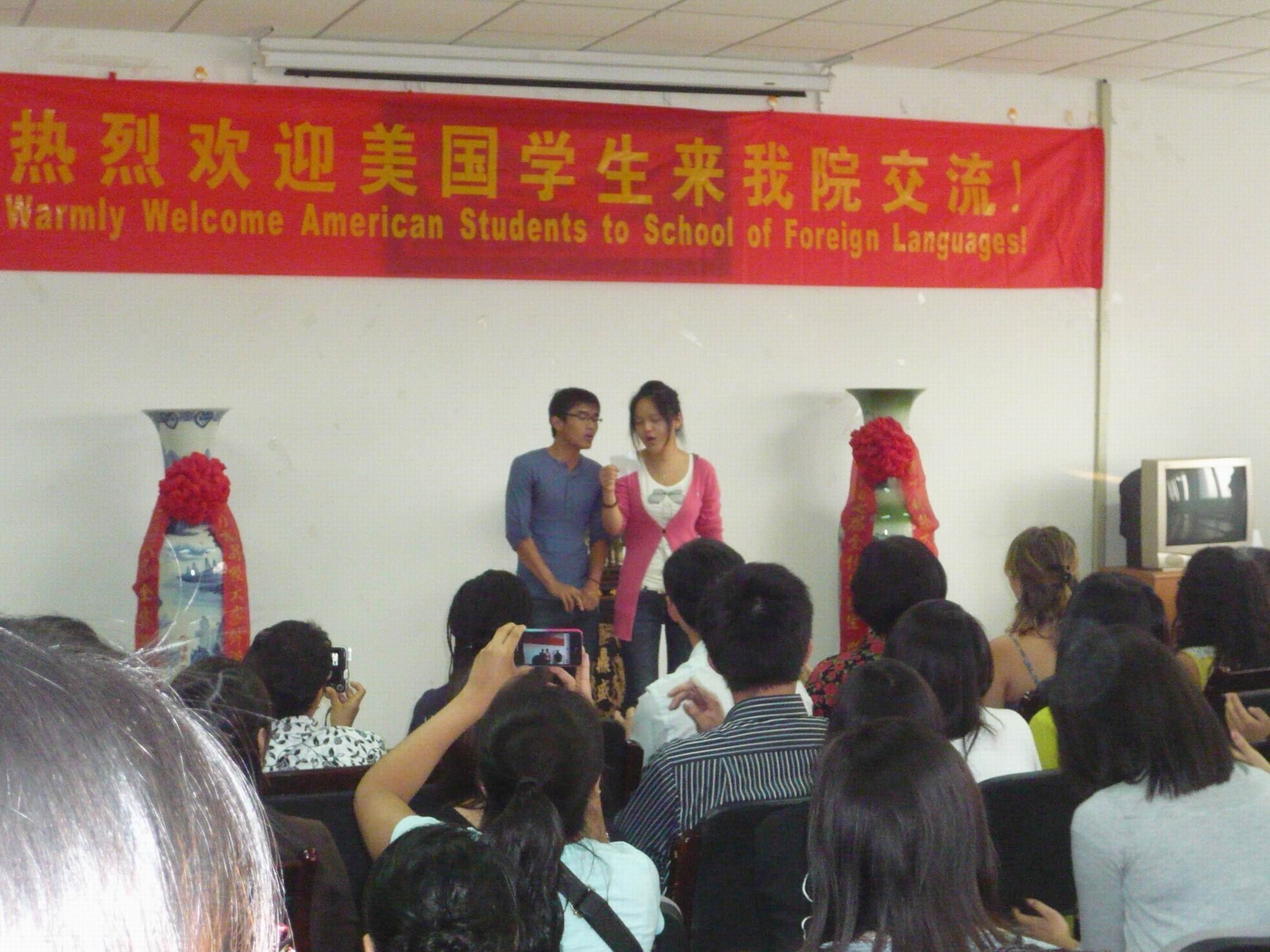 欢迎仪式后,中外学生进行了一个小时的交流讨论,围绕中美教育体制差异、西方在中国的投资环境和留学生在中国的生活等议题进行了分组讨论。在才艺表演环节,美方学生表达了他们对中华文化的热爱,其中古典诗词朗诵节目赢得了中方学生的阵阵喝彩,我校学生表演了民族乐器表演等节目,让外国友人进一步感受到中华文化的博大精深。